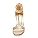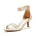 Heeled sandals with fabric, leather, patent leather, metallic leather or suede upper with an open almond toe and adjustable buckle closure