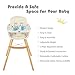 5-point Safety Harness: The five-point safety belt with adjustable length can keep baby securely in place without leaning forward and falling down, preventing them from being injured when left unattended. In addition, this chair is also equipped with an ASTM-tested wooden baffle for replacement, which provides added security.