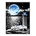 Original Design: A lighthouse nearby a quiet village stands on cliff, facing the sea. Above the shimmering sea, a full moon is shining brightly in blue. Grey and blue collide in the picture making an attracting scene suitable for living room bedroom tearoom etc.