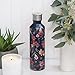 Navy blue water bottle has pink, peach, orange, and red flowers with green and blue leaves; top is wide enough for ice cubes and drip-free drinking.