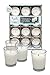 GLASS VOTIVE CANDLES: SIZE: 1.7" at the base, 2.4" height, 2" top rim, (40mmx60mmx50mm). COLOR: White votive candles. HOLDER: Glass cup. WICK: 100% Cotton, lead free. BURN TIME: 12 hours. PACK: Candles Set of 24.