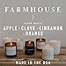 Strong aroma made with 100% soy wax and natural apple + cinnamon fragrance with notes of nutmeg, orange peel, vanilla, clove and cinnamon sticks.