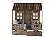 This bunkbed features an open roof concept in cabin house style. Attached straight ladder provides easy entry to top bunk. Blue tent adds more playing options.