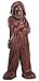 Long sleeve brown faux-fur covered hooded jumpsuit with shoe-covers on legs; attached cross body Bandolier and pouch; plastic half-mask with elastic strap closure