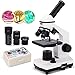 ⚡⚡⚡【Complete Accessories】Student microscope.Microscope comes with phone adapter that you can see image on your phone,share pictures or videos with your families and friends in real-time and explore the wonders of the micro world together.6 bottom apertures,10 specimens slides and 5 blank slides,meet all your biological observation need.It comes with AC power adapter,so you can use the microscope by AC power directly or 3x 1.5v AA batteries(excluding batteries).Microscope for kids 8-12.