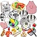 32 ITEMS REALISTIC KITCHEN PLAYSET: The KID-SIZED play set includes: stainless steel pots and pans w/ lid and handles, colander, pot rack; utensil holder contains 5 stainless steel cooking tools and 2 wooden tools; apron, kitchen mitt & mat, cutting play food, toy basket, chopping board, knife and other kitchen accessories.
