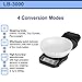 Unit Button instantly converts between 6 units of measurements (g, lbs, lbs:oz, oz, ml, kg) and displays results on an easy-to-read LCD screen - e.g. easily convert 539 grams to 1.188 pounds to 1 pound 3 ounces to 19.01 ounces to 539 ml to 0.539 kg.
