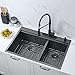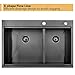 Humanized Design: This black stainless steel kitchen sink is ultra quiet with thicker & softer Rubber Noise Reduction Pads. Anti-condensation Thickening Noise Reduction Coating, absorb sound from the source. 5 Efficient decontamination layers to protect your health, X-shape flow line to avoid clogging. 10 Inch extra deep double bowl allows you to soak and clean large cookware and bakeware. Easy to clean corners make for a modern aesthetic and easier cleaning.