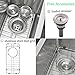 Complimentary Accessories: Multi-functional stainless steel DISH GRID protects sink bottom, 3 piece BASKET STRAINER SET, solid wood CUTTING BOARD, deep STAINLESS STEEL COLANDER, and DISH-DRYING ROLL-UP RACK, Cutout template and clip also included.