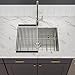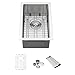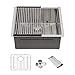 Workstation design make the sink multifuctional with extra value accessories. Package including a 33 single bowl workstation sink, stainless basket strainer, roll up drying rack, wood cutting board, drain assembly with lid cover, bottom rinse grid, hardware, template cardboard and installation instruction.