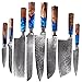 PRECISION CUTTING: Our 8-piece Damascus Steel Knife set features razor-sharp blades for precise cutting, including a chef knife, bread knife, cleaver, nakiri knife, santoku knife, utility knife, bone knife, and paring knife.
