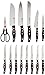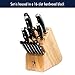 Includes 8 inch chef knife; 7 inch santoku knife; 5 inch serrated utility knife; 3 inch paring knife; six steak knives; 9 inch sharpening steel; kitchen shears; hardwood storage block