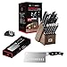PREMIUM KITCHEN KNIFE SET - 8-inch chef's knife, 3.5-inch paring knife, 7-inch santoku knife, 8-inch carving knife, 5-inch utility knife, 8-inch serrated bread knife, 4.5-inch non-serrated steak knives (6), knife sharpener, all-purpose household shears, and a sleek wooden storage block for space efficient storage.