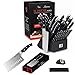 PREMIUM KITCHEN KNIFE SET - 8-inch chef's knife, 3.5-inch paring knife, 7-inch santoku knife, 8-inch carving knife, 5-inch utility knife, 8-inch serrated bread knife, 4.5-inch non-serrated steak knives (6), 6.5-inch cleaver knife, knife sharpener, all-purpose household shears, and a sleek storage knife block for space efficient storage.