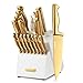 GOLDEN TITANIUM KNIVES SET – The kitchen knife set is made of premium German stainless steel with titanium plated for exceptional kitchen performance. Golden charming kitchen knives come together with white block bring the knife set unique beauty. Stainless steel adds quality and titanium improves corrosion resistance and enhances non-stick properties.