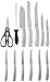 One 8in Carving Knife, one 8in Chef Knife, one 7.5in Bread Knife, one 5in Utility Knife, one 6in Boning Knife, one 3in Paring Knife, Kitchen Scissors, six 4.5 in Steak Knives, Black Rubberwood Block