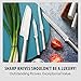 ESSENTIAL KNIFE SET – This knife set includes 7 must-have kitchen knives and a gorgeous oak knife block. Included are: the Regular Paring, Super Parer, Tomato Slicer, Cook’s Knife, Cook’s Utility, Slicer, and 6 Inch Bread Knife.