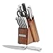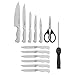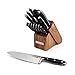 15-PIECE SET INCLUDES: 8-inch chef knife, 8-inch slicing knife, 5-inch Santoku knife, 5-1/2 inch serrated utility knife, 4-1/2 inch fine-edge utility knife, 3-1/2 inch paring knife, six 4-1/2 inch steak knives, sharpening steel, all-purpose shears, and acacia wood storage block