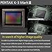 PENTAX SHAKE REDUCTION MECHANISM - Equipped with the PENTAX SR II, the K-3 Mark III provides up-to 5.5-Shutter-Step image stabilization on 5-Axis' for blur-free images when using telephoto lenses or challenging low-light. The Pentax Shake Ruduction Mechanism is comptible with every Pentax lens ever manufactured and is also used for other photo applications such as [ Pixel Shift Resolution, AstroTracer, HDR, Image Composistion, AA-Filter Simulator ]