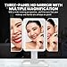 Three-Panel HD Mirror With Multiple Magnification: The tri-fold feature makes your beauty mirror easy to store and keep clean, which means you can take it anywhere you go. This lighted mirror also offers wide-angle viewing paired with 1X/2X/3X magnification options, so you can see all your features clearly and achieve perfectly flawless makeup with each detail delicately placed.