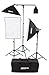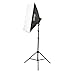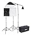 Contains 2 1-socket heads, 2 20" x 28" softboxes, 1 single-socket head with a built-in softbox, 2 65W fluorescent lamps, 2 7'6" light stands, and 1 carrying bag