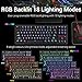 LED RGB Backlit Mechanical Gaming Keyboard 18 different preset RGB lighting modes plus 1 User programable mode 9 different colors 6 backlight brightness levels, breathing speed Precision engineered keycaps offering crystal clear uniform backlighting