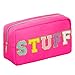 Chenille and gold glitter patch "STUFF" toiletry case is perfect as a makeup organizer, travel size toiletries bag, skin care cosmetic bag, pencil pouch or pencil case, and purse organizer for girls who love to stay put together; also perfect as birthday present for teen girls, bridesmaid gifts, and an addition to your favorite preppy clothes