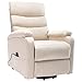 Color: CreamMaterial: Fabric (100% polyester), iron, plyboardFilling material: Foam, PP cottonOverall dimensions: 28.7" x 35.6" x 40.4" (W x D x H)Seat dimensions: 19.3" x 19.9" (W x D)Seat height from the ground: 20.9"Lifting and reclining functionIncludes a USB and hand controlWith side pocketInput voltage: AC 100-240VMassage voltage: DC 5VOptions: MassageType of massage: 6-point vibration massageAdjustable backrest and footrestAssembly required: YesNote: The 5V adapter is not included
