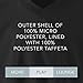 Outer shell of 100% micro polyester lined with 100% polyester Taffeta