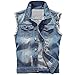 Size:S/Bust:43'',Shoulder:17'',Length:25.6'',M/Bust:44.8'',Shoulder:17.3'',Length:26.2'',L/Bust:46'',Shoulder:17.7'',Length:26.7'',XL/Bust:48'',Shoulder:18.1'',Length:27.3''.This casual sleeveless button down denim vest jacket features lapel collar,single buttons breasted,two chest pockets.The retro ripped design and slim fit design to show your figure,makes this vest more stylish.