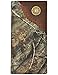 Realtree AP camo leather wallet with brown distressed leather overlay, leather lacing and tri-tone shotgun shell concho