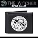 THE WITCHER BIFOLD WALLET: Black vertical faux leather travel wallet featuring a visually striking emblem from Netflix's The Witcher TV series
