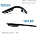 Curve to turn on. Flatten to turn off. No button to switch. A green light flashes to show the battery is working and then turns off to save battery life.