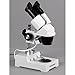 Elementary stereo microscope for home or classroom use enables students and hobbyists to inspect biological specimens, rocks, stamps, jewelry, and large specimens that require handing or manipulation