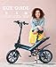INDIVIDUALIZED DESIGN: With color block looking, sports style, streamlined matte surface, this portable mini city bike is equipped with dual disc brakes, non-slip bump handlebars, LCD battery/speed Indicator, foldable handlehead, adjustable saddle(30.7"-34.6"), 14" anti-shock tires, front lamp and tail lights.
