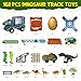 Dinosaur Toys Track Set: 168Pcs track toy set includes 142 flexible tracks, 1 battery-operated dino car, 1 dino head vehicle, 1 dinosaur transport truck, 1 tower crane, 1 dino egg, 2 slopes, 2 trees, 6 dinosaur figures, 1 door, 1 bridge. This super-value dinosaur world race track toys give kids the chance to spend hours exploring the dinosaur world.