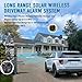 WIDE RANGE OF APPLICATION(Driveway alert,Perimeter alarm and etc)- The infrared detection range of the solar sensors up to 300 feet,that means the infrared sensing terminals can be mounted up to 300 feet apart;and will send a wireless alarm signal back to the wireless alarm receiver up to 1/2 mile away anytime someone passes between the solar sensors(Actual range will vary depending on the local terrain)