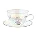 IN-HOUSE DESIGN: Pink, green, and purple watercolor paint-inspired butterfly are accompanied by electroplated silver and teal "You're Amazing" sentiment decals on the front side of the iridescent cup. Electroplated silver detail surrounds the lip of the glass and the rim of the iridescent plate, prop 65 food-safe approved. The artwork was designed by artist Pam Vale who has always loved sheer, soft, and happy colors.