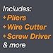 Also includes pliers, bottle opener, wire cutter and stripper, wire crimper