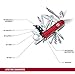 Swiss made pocket knife with 34 functions: bit case, bit Hex 4, bit Phillips 0 (Pozidrive), bit Phillips 1 (Pozidrive), bit Phillips 2, bit slotted 4, bit Torx 10, bit Torx 15, bit Torx 8, bit wrench, bottle opener, can opener, corkscrew, female Hex drive four mm for bits, female Hex drive 5 mm for D-SUB connectors, key ring, large blade, LED light, magnifying glass, mini screwdriver, multipurpose hook, pin, stainless steel, pliers, pressurized ballpoint pen, reamer, punch and sewing awl, scissors, screwdriver three mm, screwdriver six mm, small blade, toothpick, tweezers, wire crimping tool, wire cutter, wire stripper