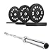 300 pounds set: 1x 7 feet Olympic Barbell (45 lbs), 2x 2.5lb, 4x 5lb, 2x 10lb, 2x 25lb, 2x 35lb, 2x 45lb cast iron plates