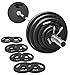 130 pounds set: 1x 7 feet Olympic Barbell (45 lbs), 2x 2.5lb, 2x 5lb, 2x 10lb, 2x 25lb cast iron plates