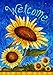 SUNFLOWER WELCOME GARDEN FLAG: A great welcome design with blue background features a bright sunflower and a ladybug on its leaf. Reads "Welcome"!