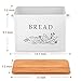 【MODERN & VERSATILE】This white bread box with "BREAD" word and patterns is printed on the one side, Classic design and color match any style of kitchen such as modern, farmhouse or country style, Convenient to collect and store food, Perfect for kitchen, home, coffee shop and bakery, Wooden lid also can be used as a cutting bread broad