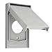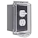 Vertical wall plate features a hinged cover that shields the outlet from weather, sunlight, animals, and other harmful outdoor elements; gray color
