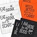 Package contains 10 orange 'Witch Better Have my Candy', 10 White 'Eat Drink and be Scary', and 10 Black 'I am Here for the Boos' beverage cocktail napkins.