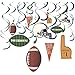 FOOTBALL-THEMED METALLIC SWIRLS: This set of Football-themed metallic party decoration foil swirls contains 30 varied pieces in total, 15 of which feature footballs, "Go Team!" flags, and "We're #1! hanging pointed finger cutouts made from 355 gsm cardstock.