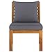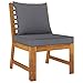Cushion color: Dark grayMaterial: Solid acacia wood with an oil finish, fabric (100% polyester)Dimensions: 21.3" x 23.8" x 31.9" (W x D x H)Seat height from the ground: 13.4"Seat cushion thickness: 3.1"Back cushion thickness: 5.9"Weather resistantAssembly required: YesDelivery contains:1 x Middle sofa1 x Seat cushion1 x Back cushion
