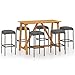 Table:Material: Solid acacia wood with an oil finishDimensions: 55.1" x 27.6" x 40.9" (L x W x H)Chair:Color: GrayCushion color: AnthraciteMaterial: Poly rattan, powder coated steel, fabric (100% polyester)Dimensions: 15" x 15" x 29.9" (W x D x H)Cushion thickness: 1.2"Assembly required: YesDelivery contains:1 x Table6 x Bar stool6 x Seat cushion