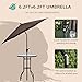 Patio Umbrella: 6.6 Ft umbrella with steel pole; table umbrella tilts by pressing plastic ring on pole; 100% polyester material